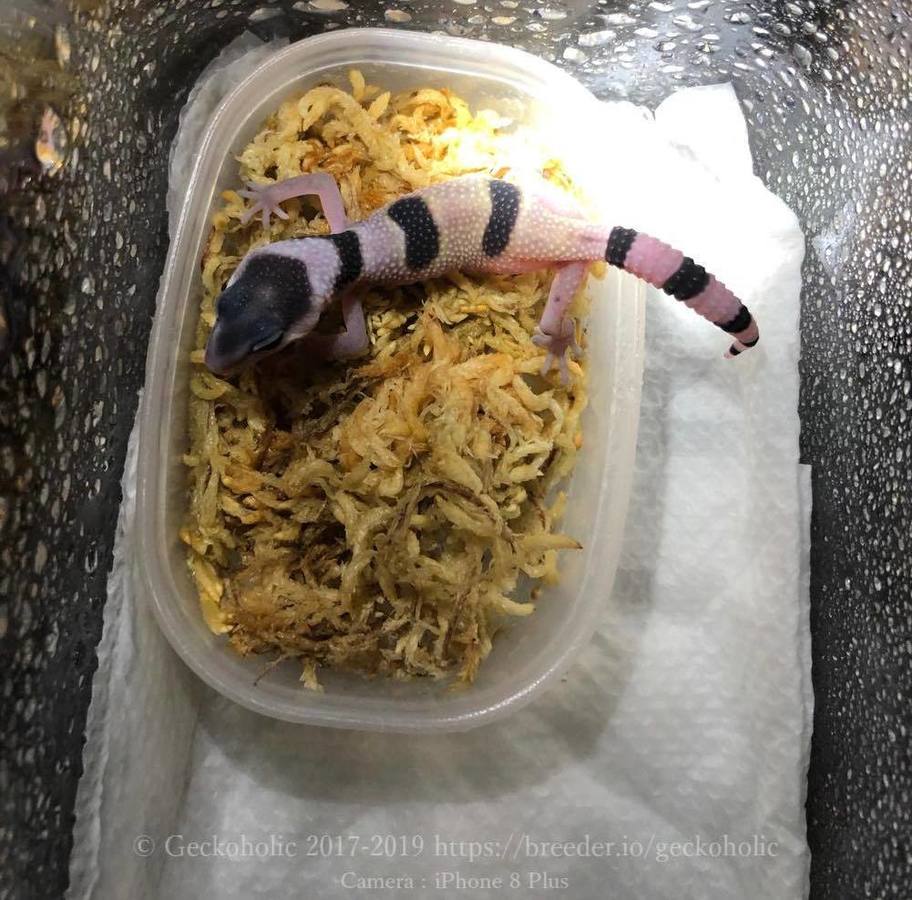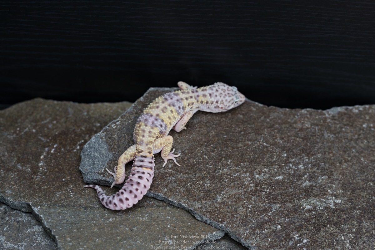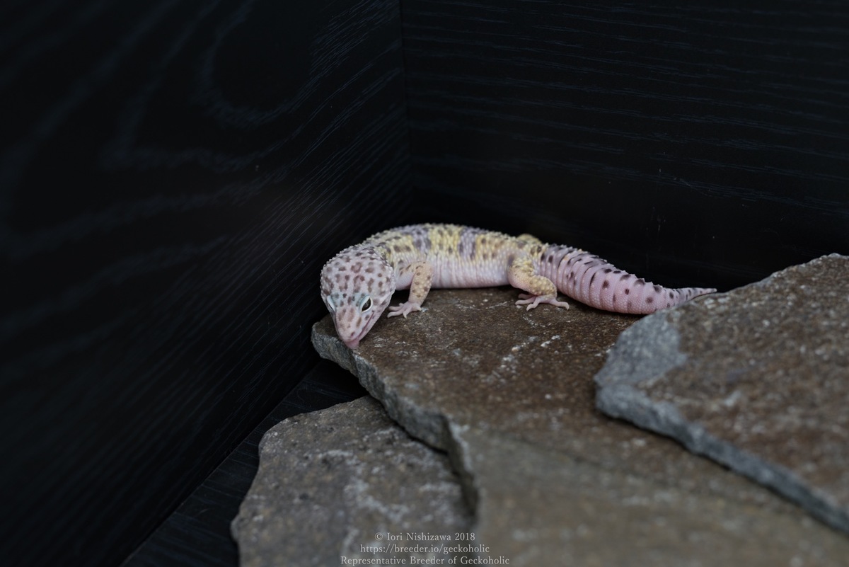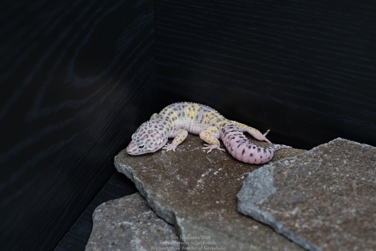 この個体が累代何代目かは不明ですが(Geckoboaに問い合わせたら解る?)、ファスキオラータス以外の血を入れていない純血の筈です(筈、としているのはGeckoboa自身が上記の様な説明をしている為).