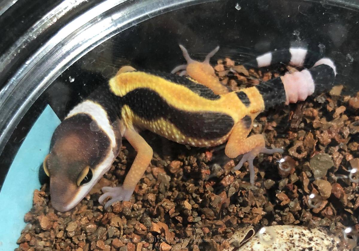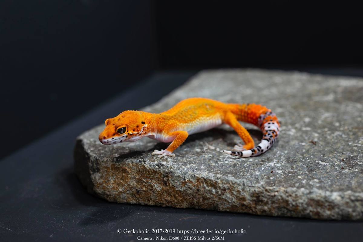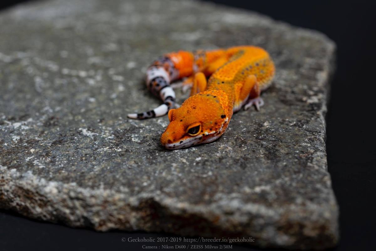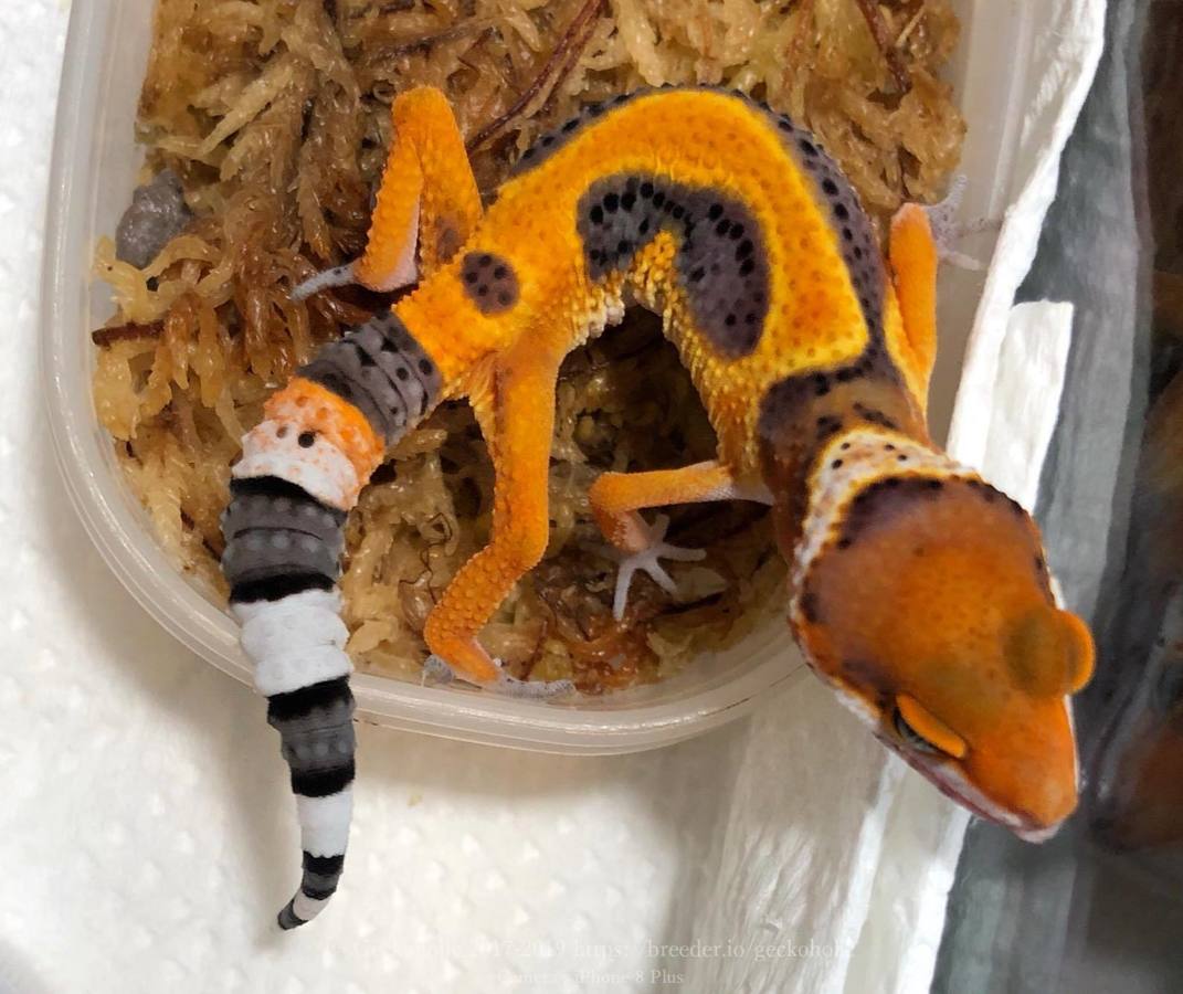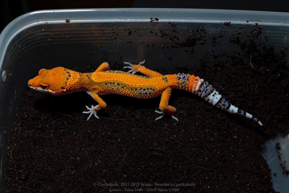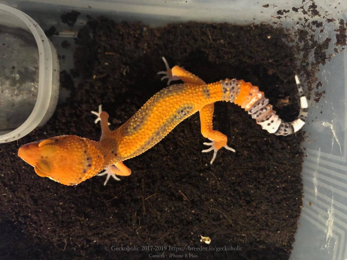 雌親はGeckoBoaの物でラベルもちゃんとあるのですが、雄親はGeckoBoaではありません。「GeckoBoaに近しい(らしい)ブリーダー」で「片親はGeckoboaのBlood&ClownGを使っている」所までは追えたのですが、逆にいうとそれ以上の詳細は不明です。