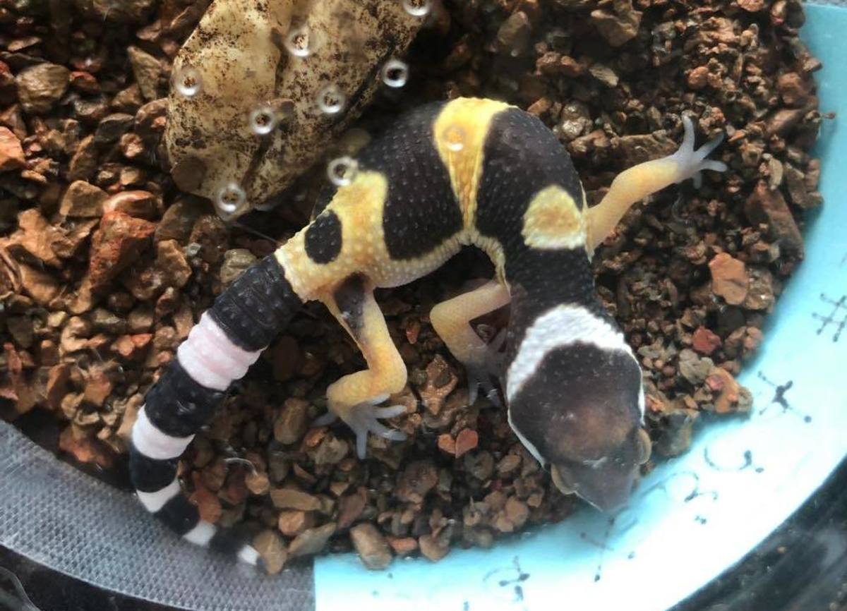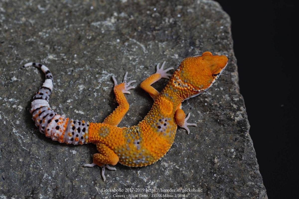 雌親はGeckoBoaの物でラベルもちゃんとあるのですが、雄親はGeckoBoaではありません。「GeckoBoaに近しい(らしい)ブリーダー」で「片親はGeckoboaのBlood&ClownGを使っている」所までは追えたのですが、逆にいうとそれ以上の詳細は不明です。