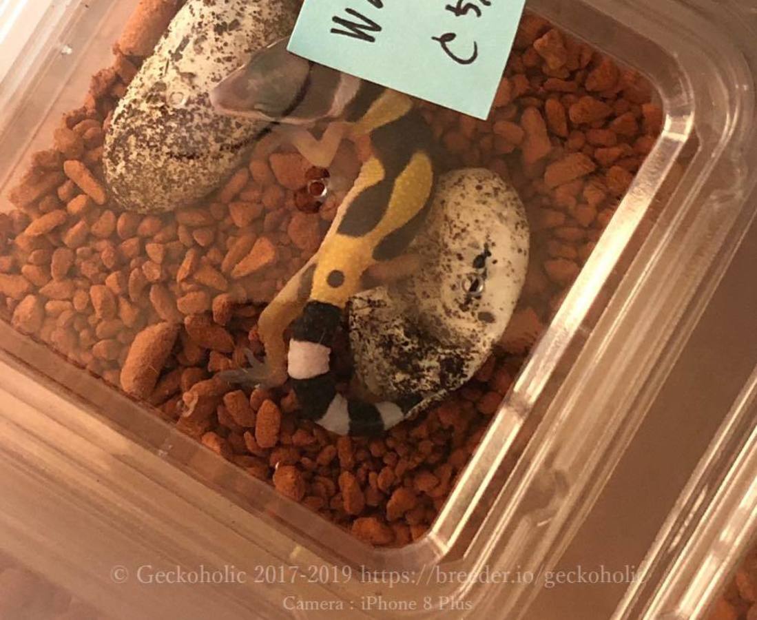 雌親はピグメントの大きく柄を崩す感じのW&Yなのですが、今の所この雌親からは(Blood & Clown G以外の雄親からも)そういった表現の個体は産まれていません。しかし非常に細かい柄でとても乱れた様な個体は複数産まれておりそれがW&Yなのかと思っていたのですが、柄が少なくでもW&Yっぽい色味の個体も産まれて「これはW&Yと断定するのは困難である」と判断しました。