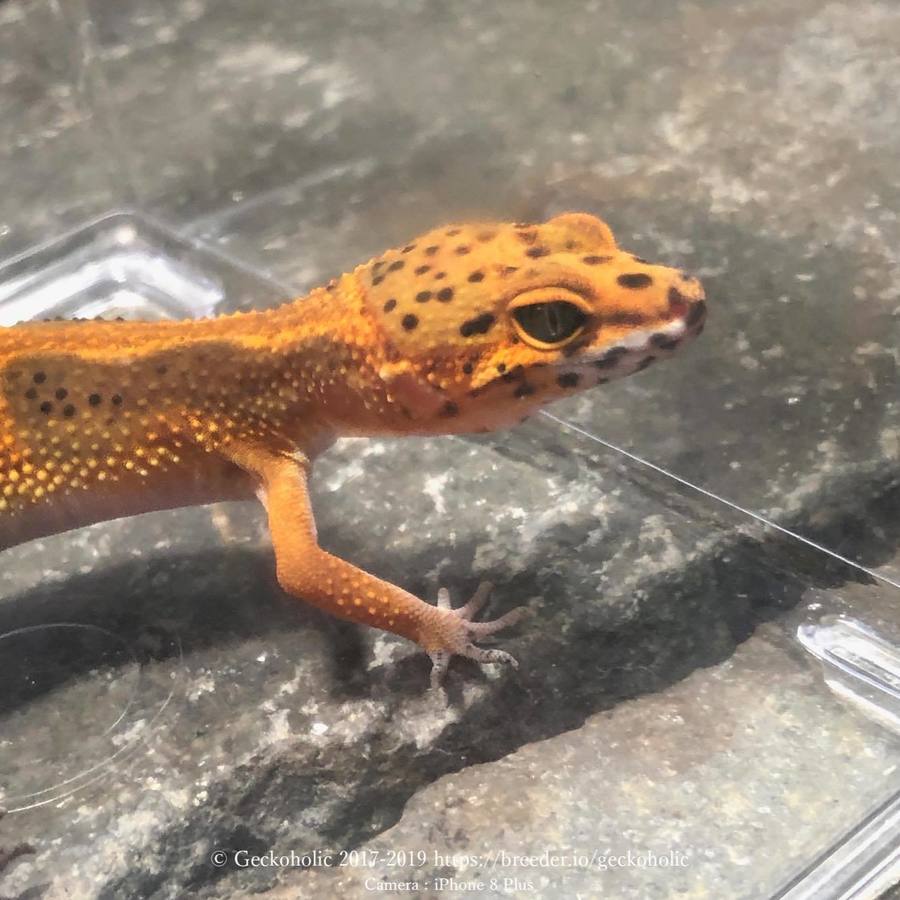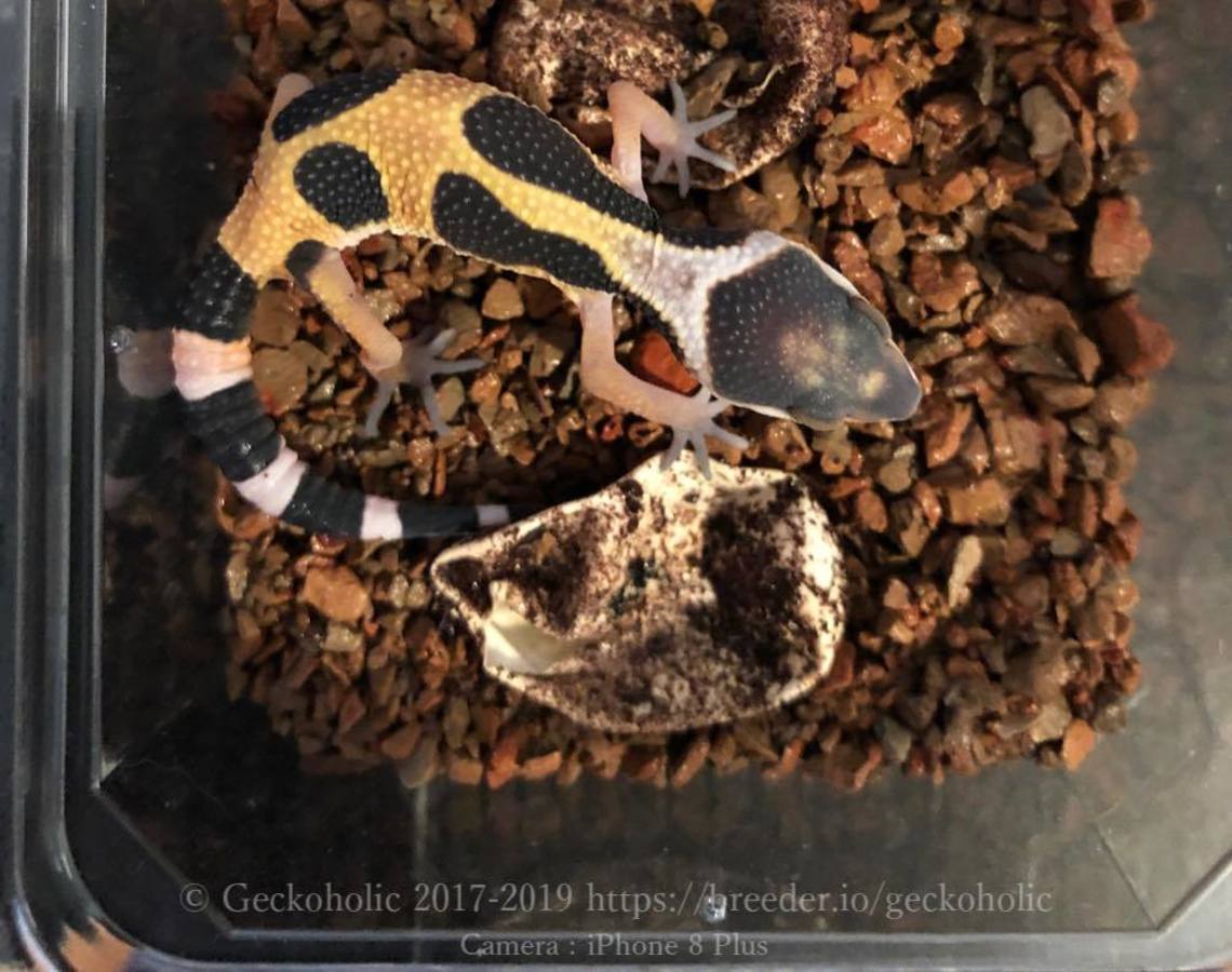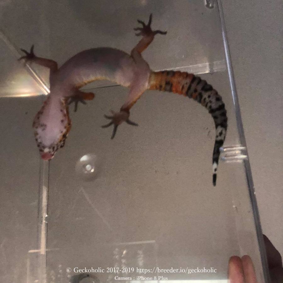 アフガンタンジェリン(Afghan Tangerine)とBlood & Clown Gの交配で得られた個体です。Blood & Clown Gの祖先がRAPTOR由来のラインを含む為、small poss het TremperAlbino Eclipse(少ない可能性だがトレンパーアルビノとエクリプスのヘテロを持っている可能性がある)としています。
