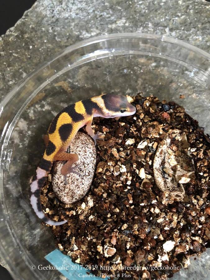 この組み合わせはいわゆる「緑色(エメリン)に見える表現」を持つ別集団を品種間交配したらどうなるのか?を知る事が狙いです。ヒョウモントカゲモドキは本当に緑色になる色素胞がある訳ではないのですが、緑色っぽく見えるとされている多因子は繁殖集団によって全て別なのか、それとも共通している遺伝子があるのか?を検証となります。遺伝子解析する訳ではないので、あくまでも想像/妄想の域を出ませんが。