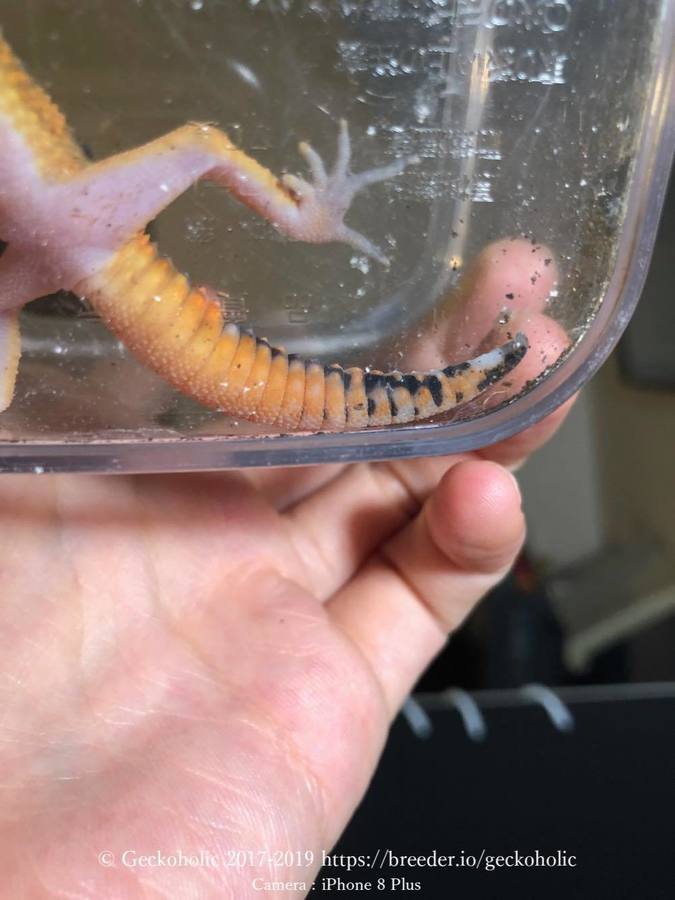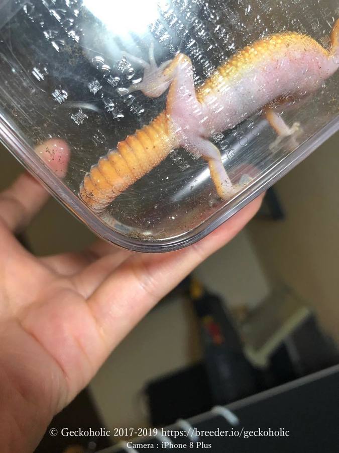 雄親のBlood & Clown Gの祖先がRAPTOR由来であり、尚且サイクスエメリンも「すべてのサイクスエメリンはposs Tremper Ablino, Eclipse」とGeckoEtcに記載されていますので、small poss het RAPTOR(トレンパーアルビノとエクリプスが隠れヘテロの可能性がある)としています。